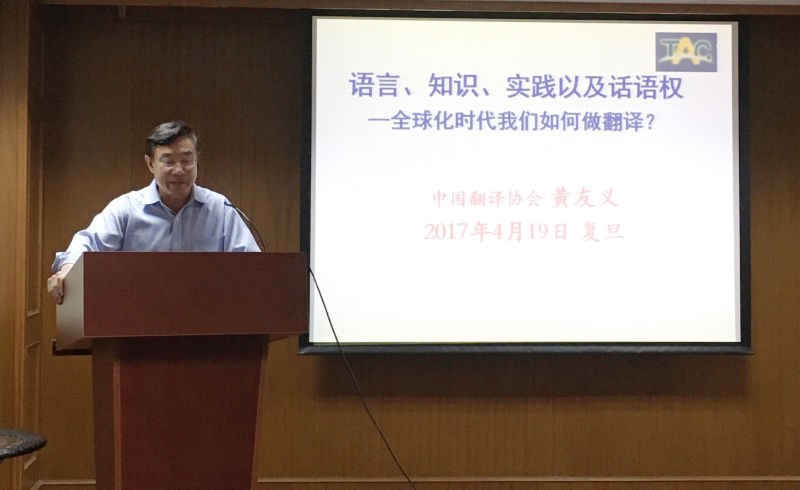 2017年4月19日下午13:30- 16:00,中国外文局原副局长兼总编辑、中国翻译协会副会长兼秘书长、MTI教指委主任委员黄友义教授应邀做客赢博首页_赢博(中国),外文学院,为英文系、翻译系师生带来精彩讲座。讲座由副院长卢丽安教授主持。