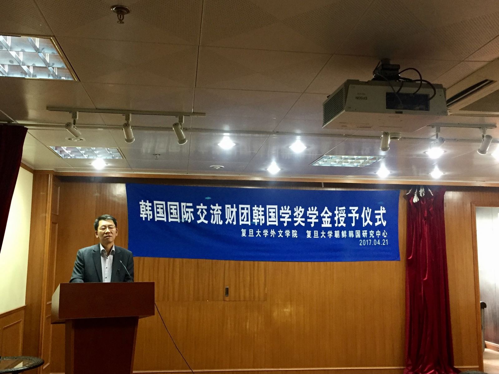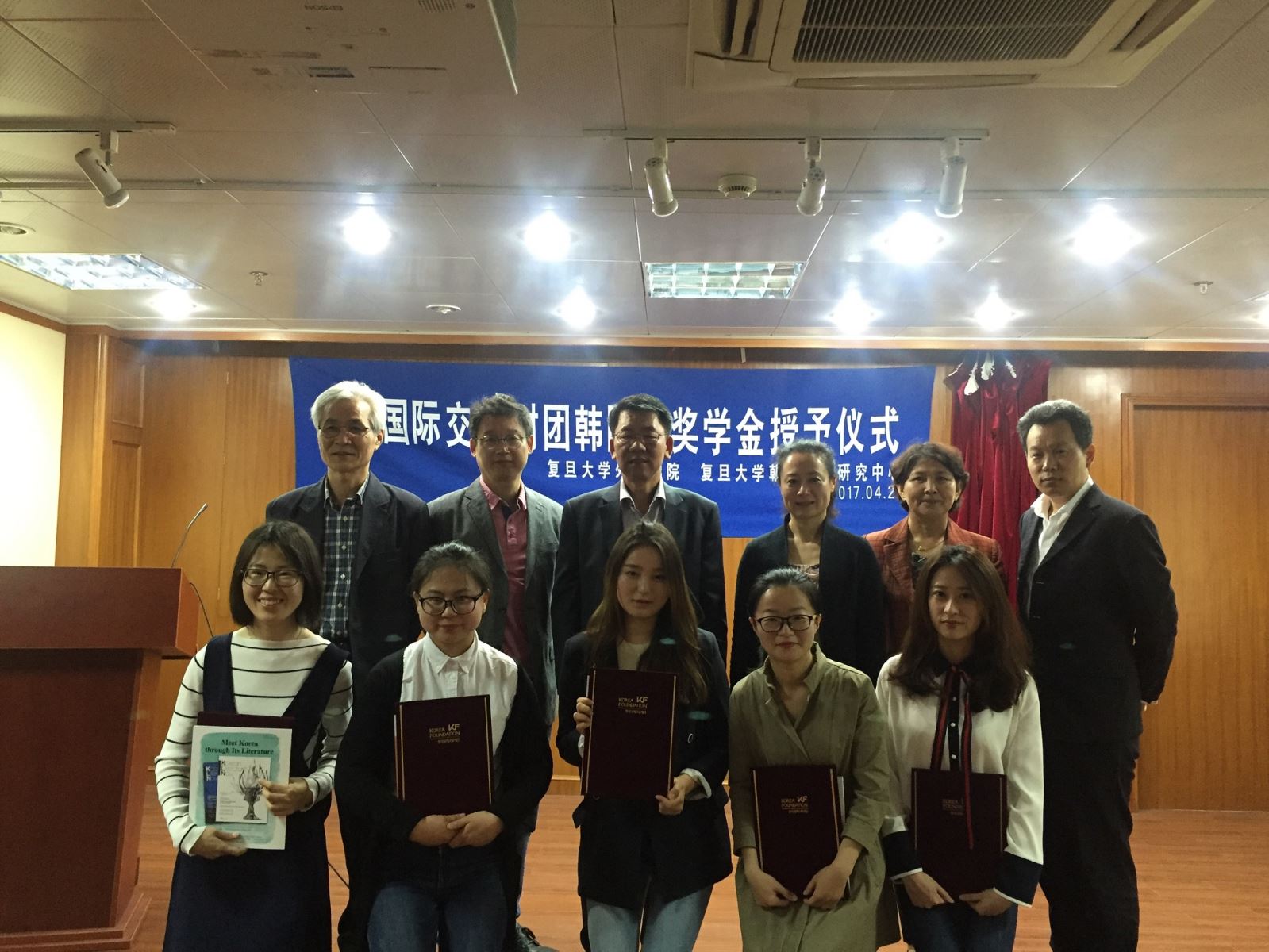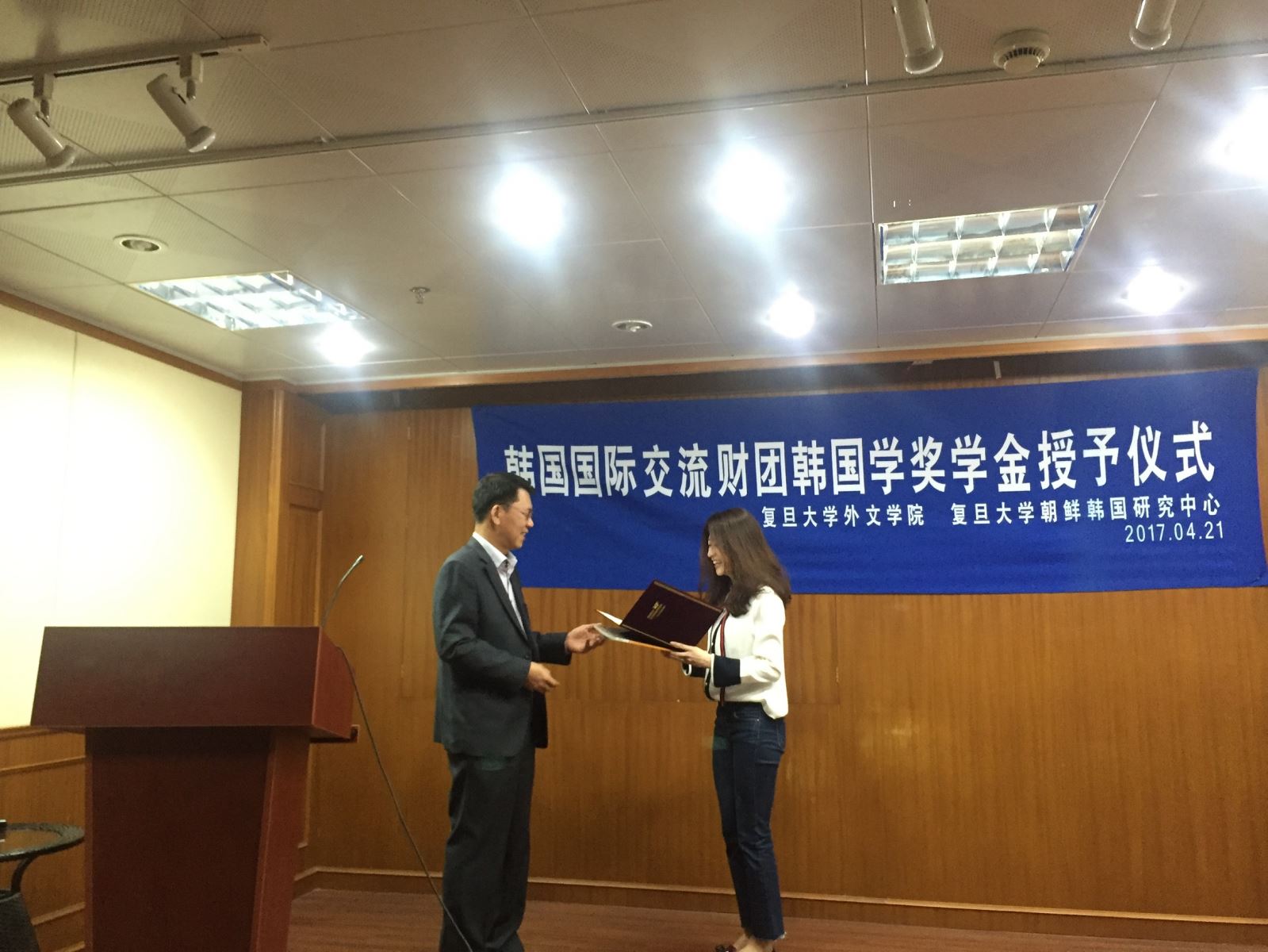 2017年4月21日上午,韩国国际交流财团韩国学奖学金授予仪式在赢博首页_赢博(中国),文科楼209会议室如期举行。