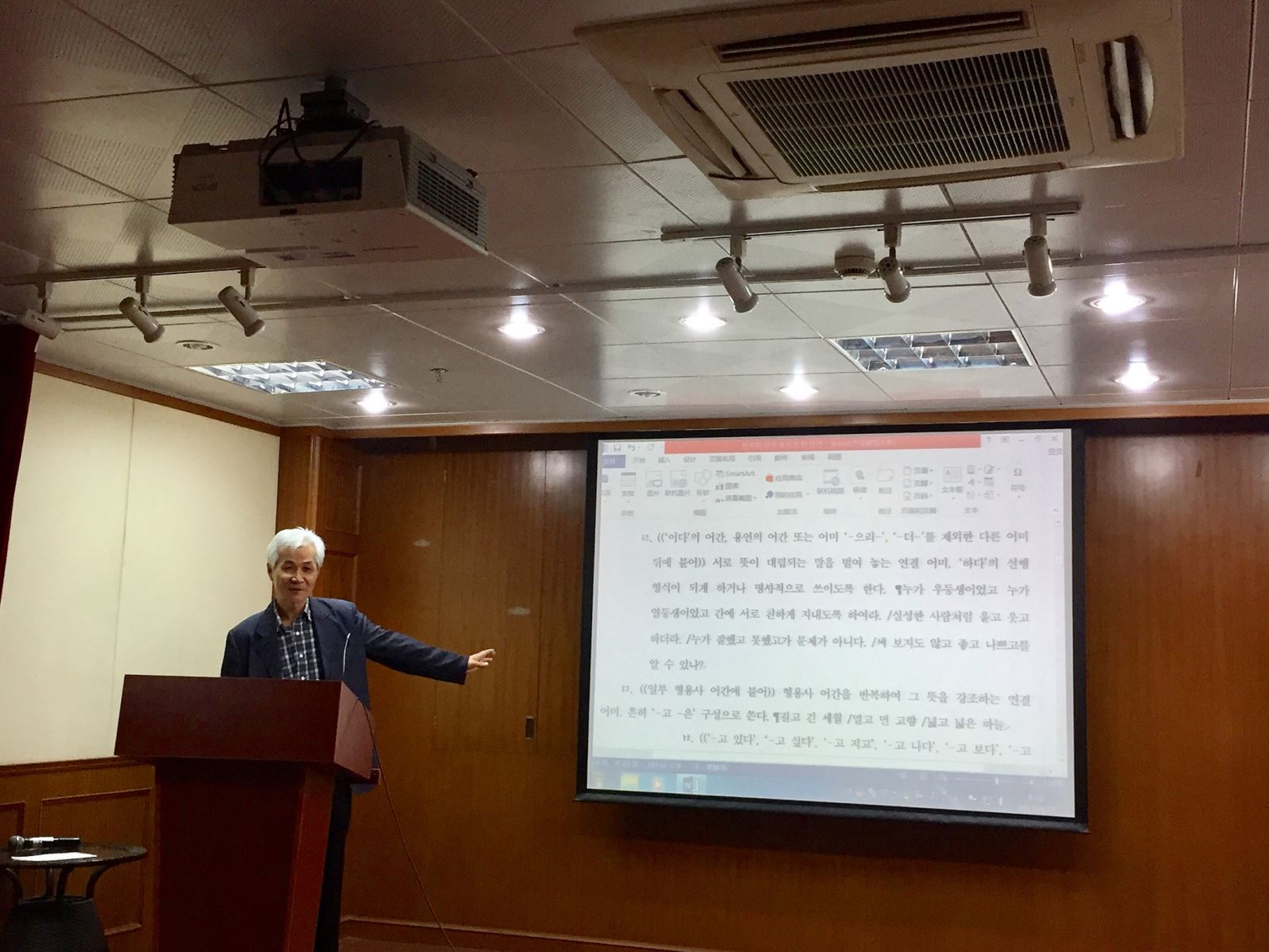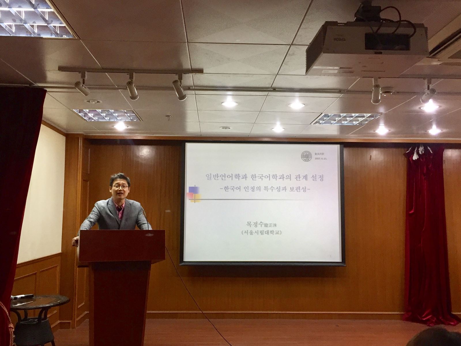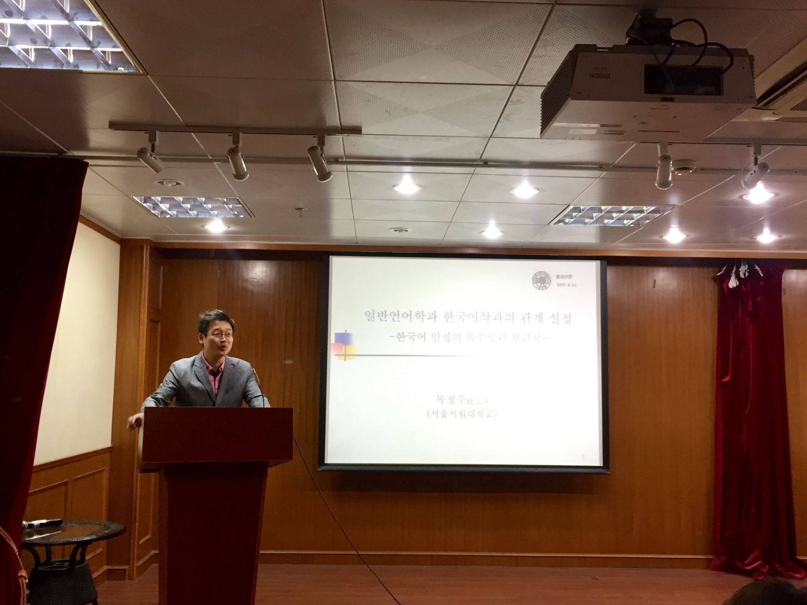 紧接着,来自韩国首尔市立大学的睦正洙教授以“普通语言学与韩国语言学的关系:韩国语人称的特征与共性”为主题展开讲座,讲座由韩文系蔡玉子教授主持。