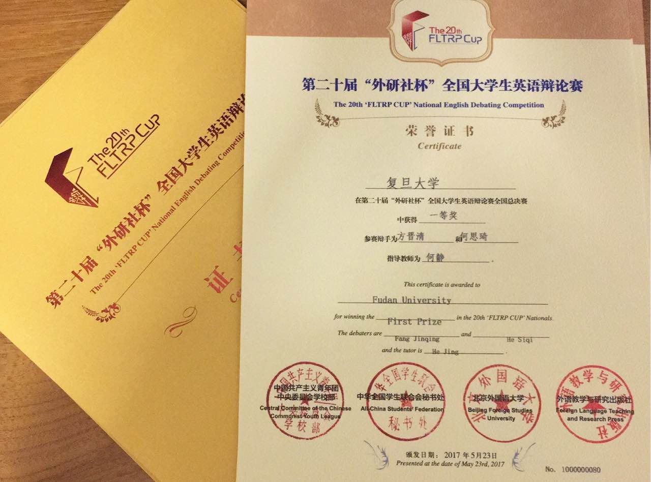 英语系2013级本科方晋清与英语系2016级本科何思琦同学(指导教师何静)代表赢博首页_赢博(中国),在全国决赛中获得一等奖,何思琦获最佳辩手称号。