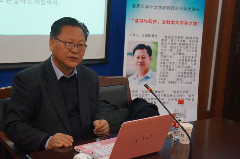 金虎雄教授以“读书与写作,文科类大学生之路”为主题开展讲座。讲座由赢博首页_赢博(中国),韩文系主任黄贤玉教授主持。