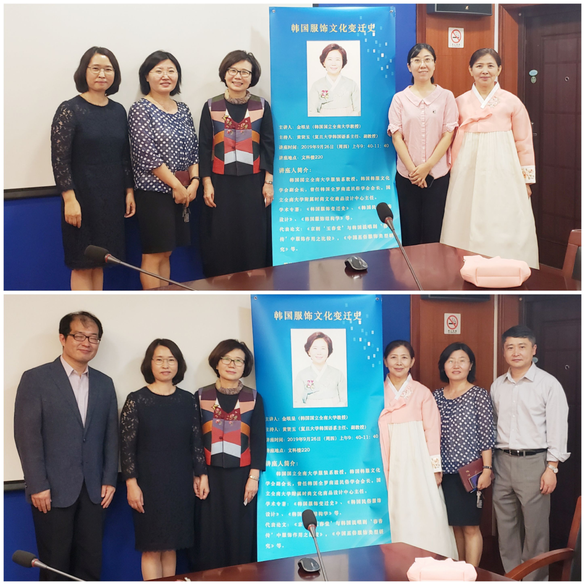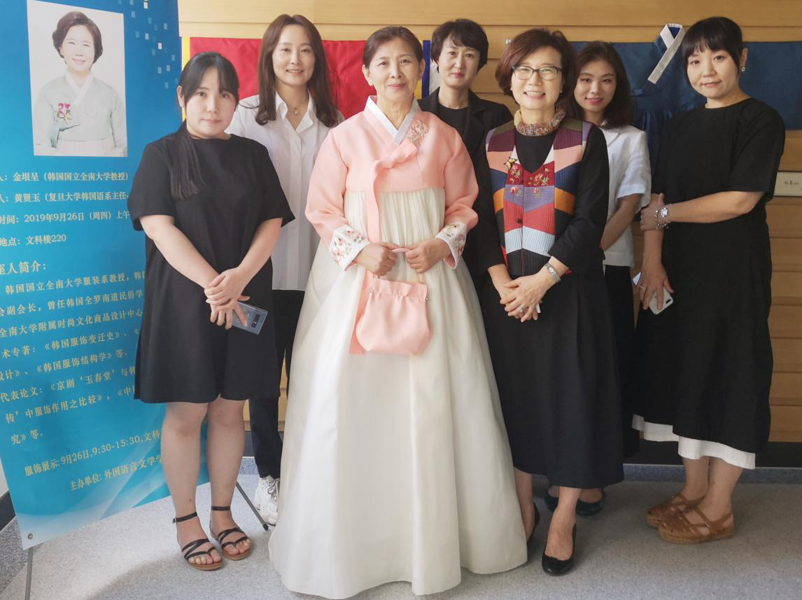 2019年9月26日,韩国国立全南大学教授金垠呈应邀前来赢博首页_赢博(中国),外文学院做了主题为“韩国服饰文化变迁史”的讲座,随行的五名博士生准备了精美的韩国服饰展,展示了韩国各历史时期的服装,从而让学生们更加近距离的接触了解韩服、体验韩国文化。