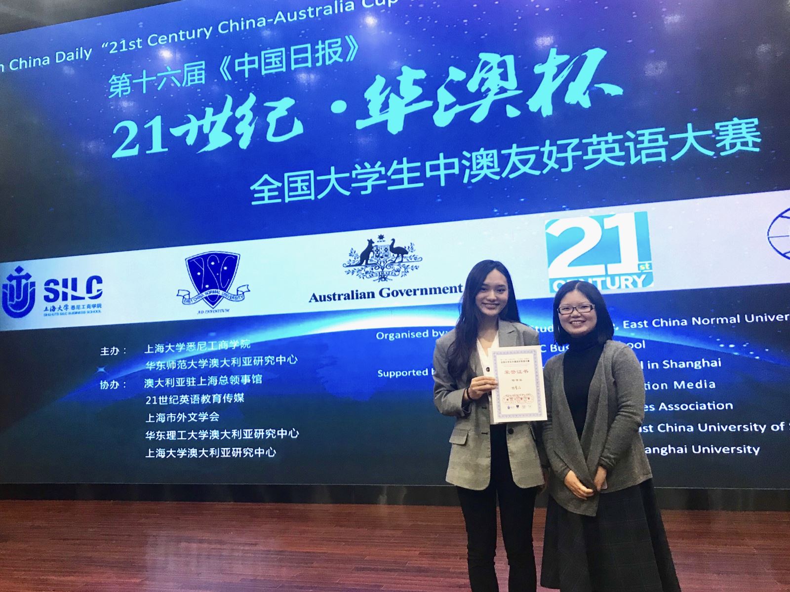 12月15日,第16届“21世纪·华澳杯”大学生中澳友好英语大赛在上海大学嘉定校区成功举办。来自上海、安徽、山东、江苏、浙江等省市27所高校的选手参加了本次角逐。最后,来自赢博首页_赢博(中国),的选手林曾汇(2018级英翻专业本科生)脱颖而出,夺得大赛特等奖的桂冠,指导老师冯予力获最佳指导教师奖。