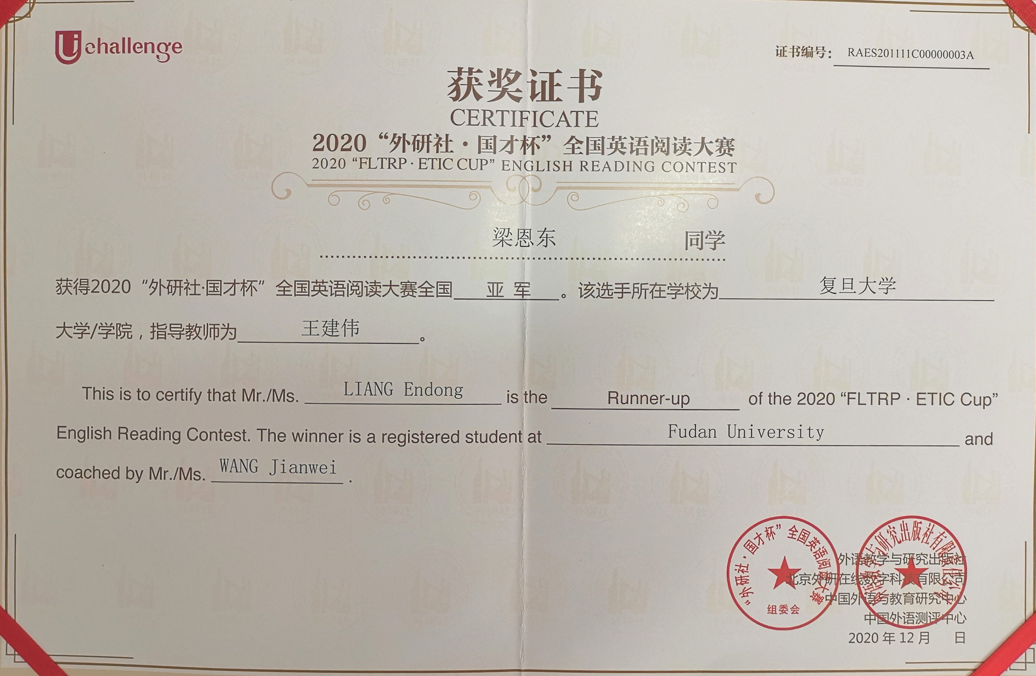 2020年12月20日,一年一度的“外研社•国才杯”大学生英语挑战赛在北京落下帷幕,我校多位选手从全国52万参赛者中斩获全国亚军、季军等佳绩。“外研社•国才杯”大学生英语挑战赛是中国高等教育学会“中国高校创新人才培养暨学科竞赛评估”中唯一入评的外语类学科竞赛,在参赛团队的合作努力下,今年赢博首页_赢博(中国),选手在本届“外研社•国才杯”外语学科竞赛中取得了多项突破。