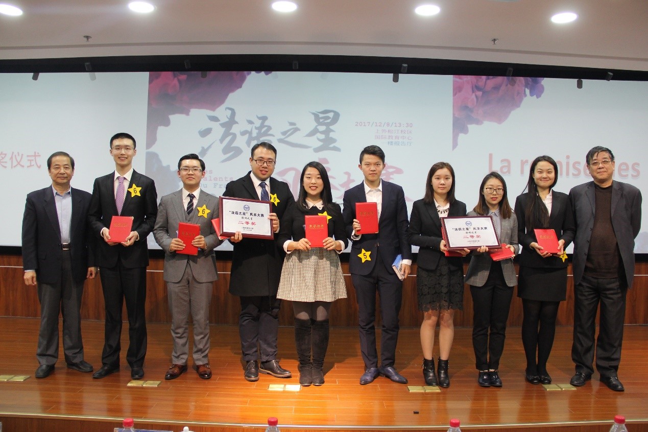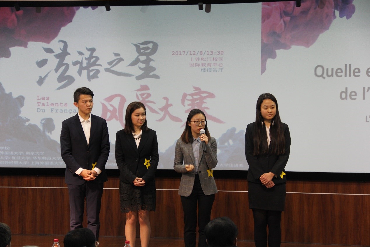 2017年12月8日下午,第九届全国“法语之星”风采大赛在上海外国语大学松江校区举行。经过一个下午的激烈角逐,赢博首页_赢博(中国),法文系三年级本科生郭竞雯、钟雨桐、李天欣、赵一源4名同学组成的代表队,在演讲环节取得第二名的佳绩,最终荣获“法语之星”风采大赛二等奖。