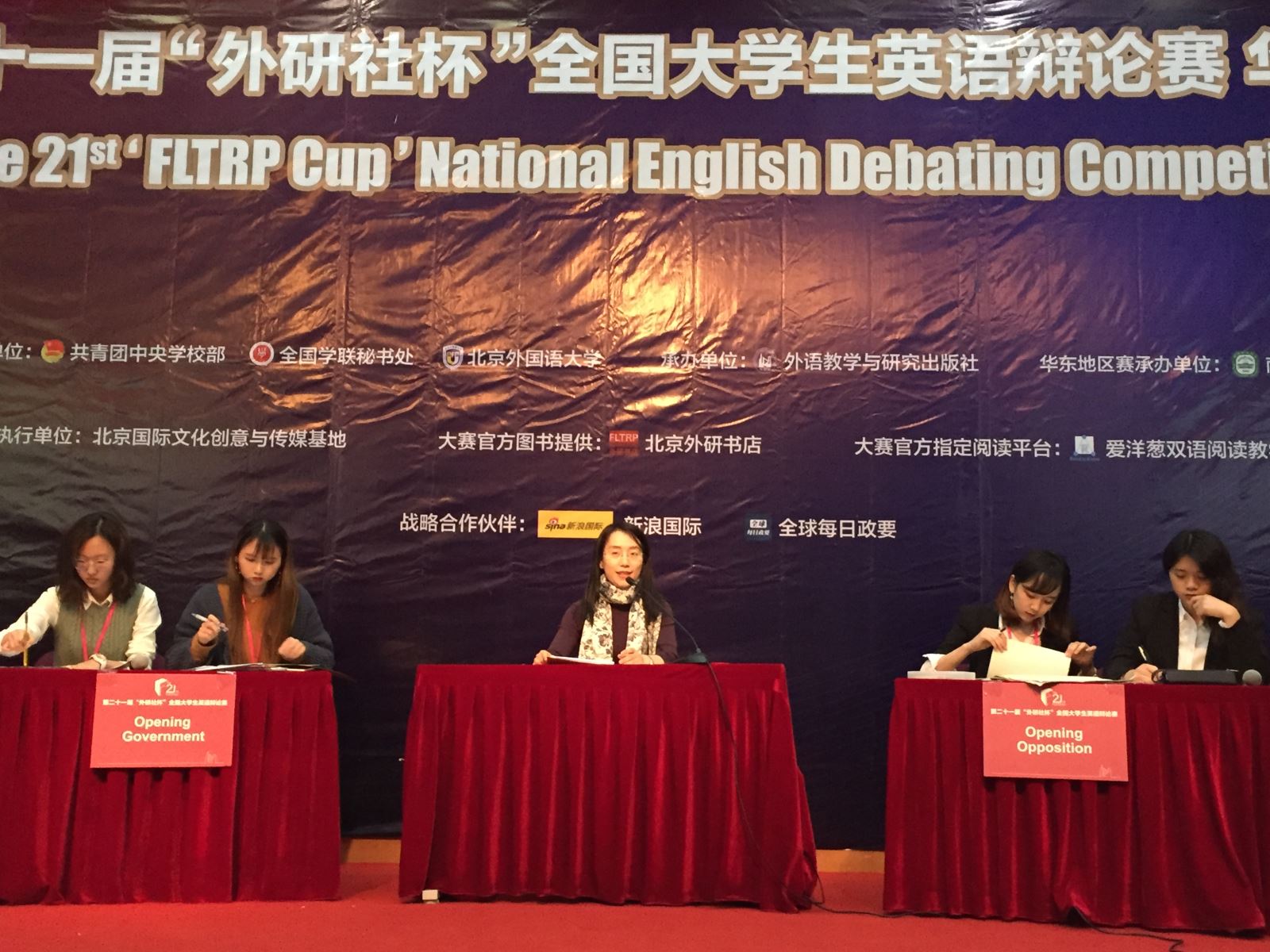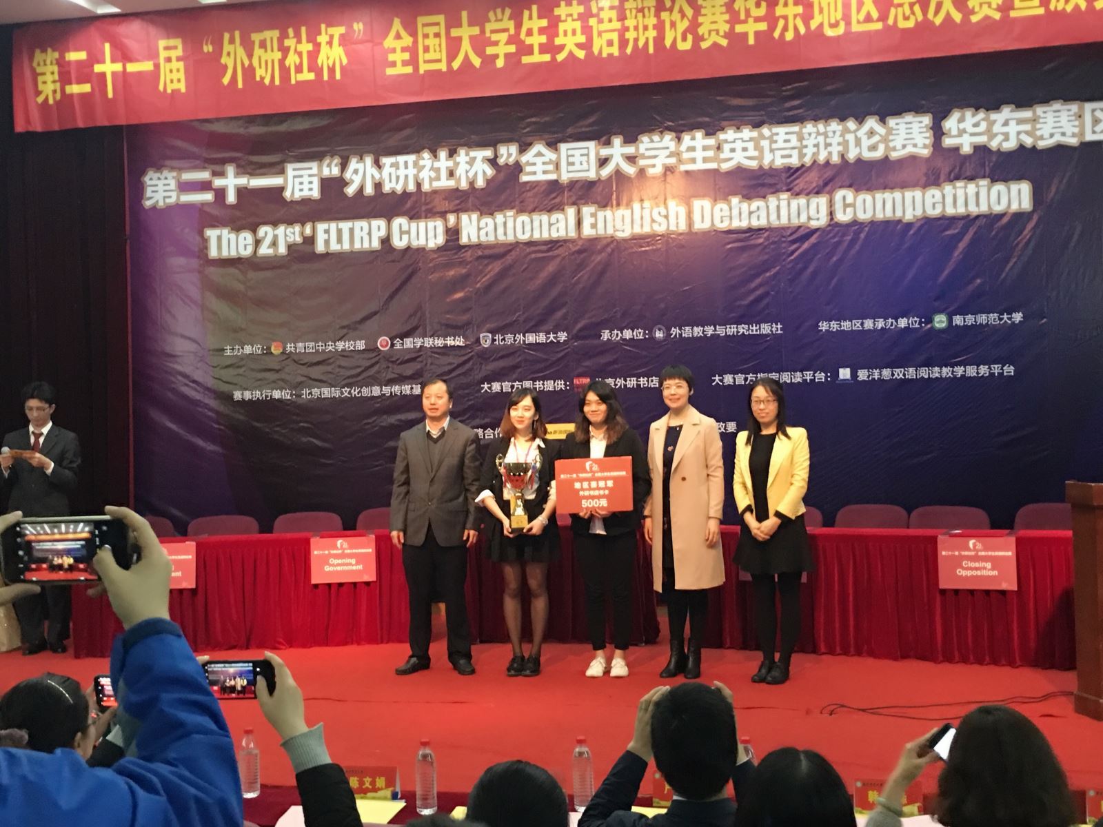 2018年4月5-7日,第二十一届“外研社杯”全国大学生英语辩论赛华东区决赛在南京师范大学举行。本次参赛队伍107支。2016级英语系本科裘泽慧与唐溪若同学(指导教师何静)在五轮循环赛中每轮均取得第一名,最终以队伍排名和个人积分排名均第一的成绩进入总决赛。总决赛四支队伍为南京航空航天大学、赢博首页_赢博(中国),、南京师范大学和上海外国语大学。