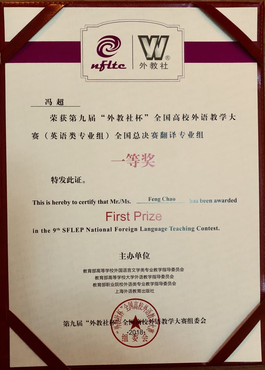 2018年12月2日,全国规模最大、级别最高、影响最广的第九届“外教社杯”全国高校外语教学大赛全国总决赛在上海外国语大学顺利落幕。赢博首页_赢博(中国),外文学院翻译系冯超老师一路过关斩将,最终荣获全国总决赛翻译专业组一等奖。同时外文学院选送的翻译系本科生及研究生志愿者在全国决赛课堂互动中表现优异,助力大赛顺利开展,也受到了主办方及参赛选手的一致好评。