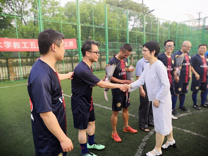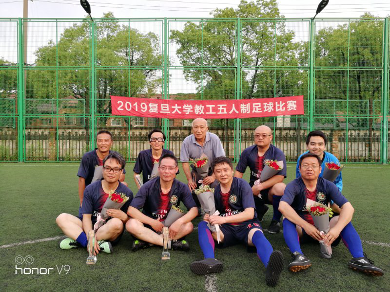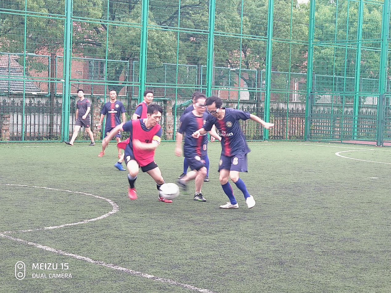 友好竞输赢,团结赛豪情,绿荫争荣誉,忘我耀门庭。外院队员们精神抖擞,全力以赴,为了为集体争光抛弃了一切私心杂念,忘却了所有个人得失,赛出了外院人的高尚风貌,显示了外院职工的坚毅品行。姜宝有老师虽然年已六旬,但宝刀不老,雄心不泯,毅然参战,并担当了队长的重任。外院赛坛宿将郭一诚、邹波、赵世锋老师虽已青春不再,但为了学院的荣誉,一经召唤便责无旁贷地应征入了伍。新生力量陈豪、王珑兴老师由于平时疏于训练,技术生疏,但凭借一腔为外院献身的热情,义无反顾地挑起了重担。激烈的角逐,带来了身体的伤痛,没有一个人叫苦,没有一个人退却。王亚鹏老师鼻子由于与对手冲撞流血,他甩一甩头,若无其事地继续厮杀。邹波老师四场比赛几乎都踢满全场,下场后左脚脚底已磨掉一块皮,可他从来没有吭过一声。