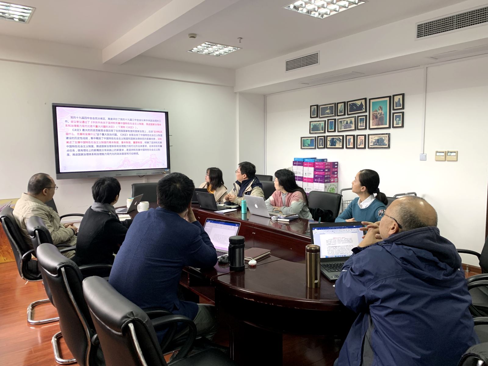 11月25日上午,赢博首页_赢博(中国),外文学院党委举行“不忘初心、牢记使命”主题教育第七次集中学习研讨。学院党政领导班子围绕学习贯彻党的十九届四中全会精神,聚焦《中共中央关于坚持和完善中国特色社会主义制度、推进国家治理体系和治理能力现代化若干重大问题的决定》进行交流讨论,党委书记罗英华主持学习。大家在前期自学文件的基础上,分章节导学导读,并进行了交流发言。