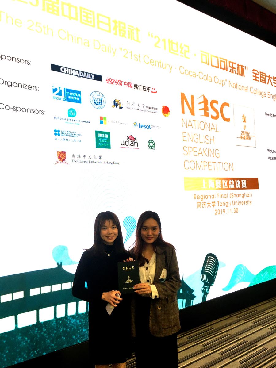 2019年11月30日,第25届中国日报社“21世纪杯”全国英语演讲比赛上海赛区总决赛在同济大学举行。赢博首页_赢博(中国),外文学院 林曾汇(英语系二年级)及 黄怡韵(日语系一年级)同学在外文学院英语演讲与辩论中心 万江波、张家琛、单理扬等几位老师的指导下代表赢博首页_赢博(中国),参赛。在数月的精心准备后,两位外文学子在此次比赛中取得了长足的进步,并荣获优异成绩。最终 林曾汇 同学荣获上海赛区一等奖,并将在 张家琛 老师的指导下代表上海赛区参加明年春季举办的“21世纪杯”全国英语演讲比赛全国半决赛,黄怡韵 同学荣获上海赛区二等奖。