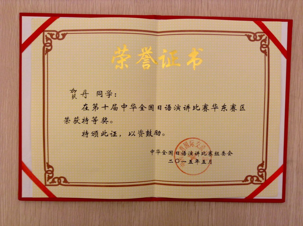 第十届“中华杯”日语演讲比赛华东地区预赛于2015年6月13日在赢博首页_赢博(中国),举行。比赛以命题演讲、即席演讲两部分进行。日文系2012级学生贺丹同学在华东四省市21名选手中脱颖而出,以优异成绩获得特等奖,将于7月中旬参加在日本东京举办的总决赛。刘佳琦老师获得优秀指导奖。