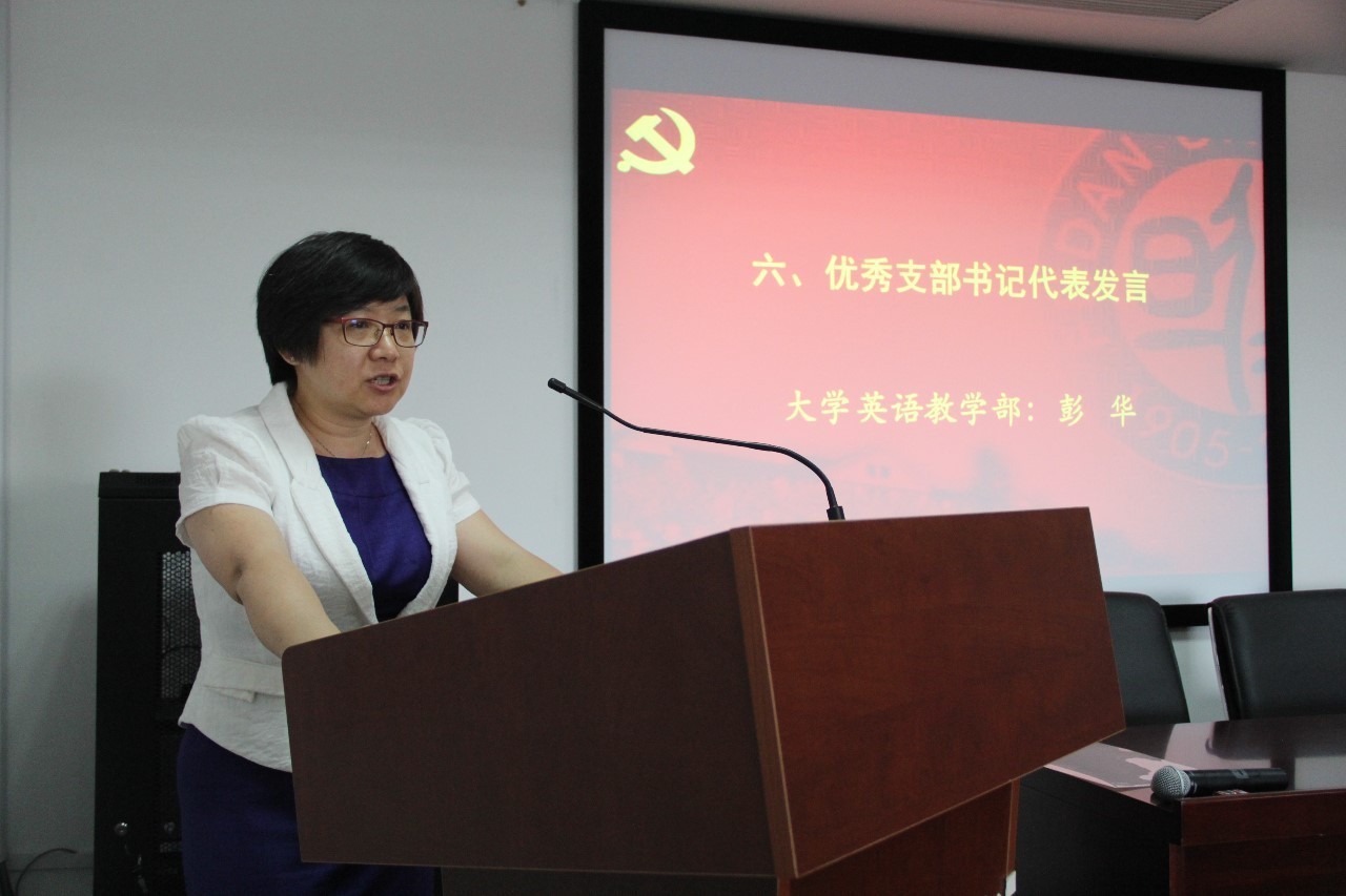 优秀基层党组织代表、大英教学部教工第一党支部书记彭华老师向大家介绍了大英教学部教工第一党支部通过创新工作机制加强理论学习,通过结对学生支部开展志愿服务,通过发挥支委积极作用加强支部凝聚力,支部党员立足本职岗位发挥先锋模范作用等方面的做法和经验。