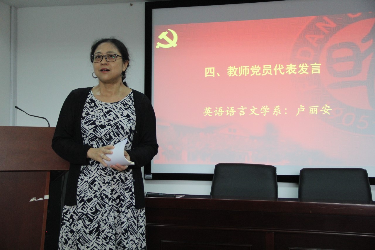 教师党员代表、副院长卢丽安老师结合在台湾成长、英国留学和上海工作发展的经历,介绍了自己对历史、对民族、对国家的思考,以及对中国共产党领导中国社会发展进步的认识。她认为入党是追求进步的表现,既要有思想政治认识上提升,也要结合本职工作,践行服务、牺牲的精神,积极参与社会建设,为人民服务,为子孙后代谋福祉。