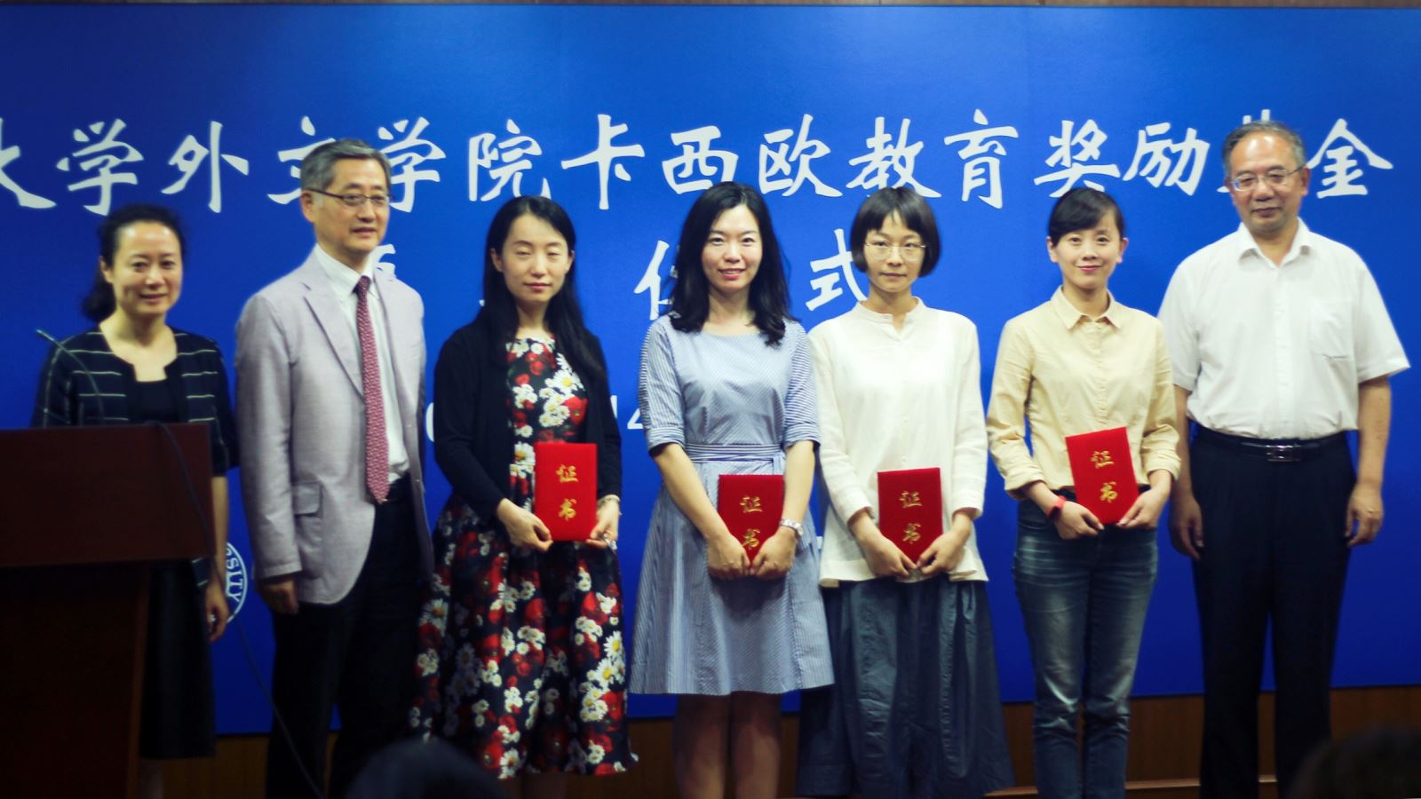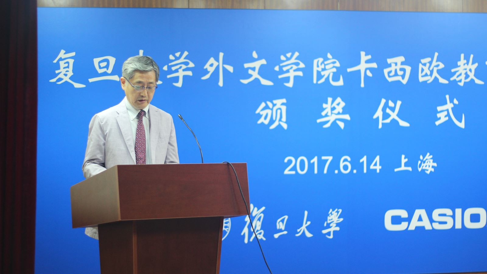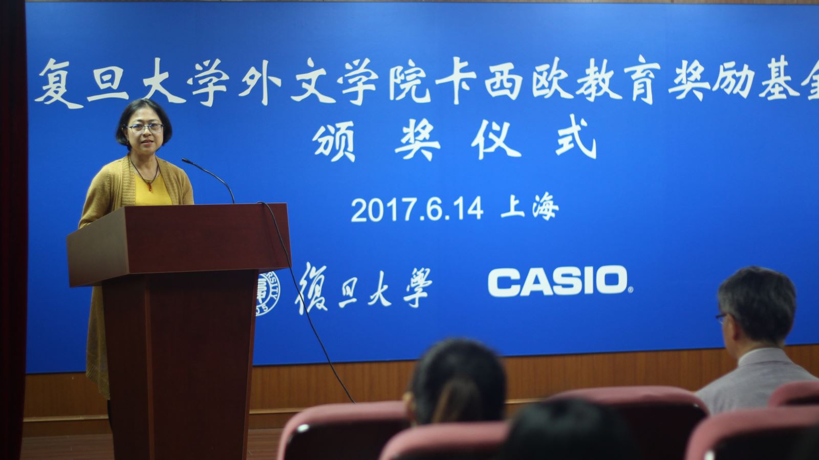 2017年6月14日下午,外文学院在文科楼209室举行2016年度卡西欧奖教学金颁奖仪式。出席仪式的有卡西欧(中国)贸易有限公司总经理金田公一、总经理助理王璐瑾、电子教育营业部部长路银霞、副部长唐金良、担当唐峥嵘,外文学院党委书记李倩、副院长卢丽安、副院长刘炜、学术委员会主席魏育青,以及外文学院获奖师生。颁奖仪式由外文学院副院长刘炜主持。