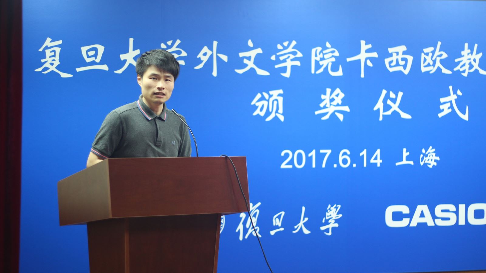 获奖师生代表分别发表了感言。法语系陈杰老师代表获奖教师发表感言,他谈及了自己的学术之路,感谢外文学院为青年教师提供的优越、舒适的工作环境以及科研方面的鼓励与支持,也感谢卡西欧公司为我院提供的资助,他将会更加努力工作。本科生孙予聪讲到,感谢卡西欧公司为她提供了这样一个平台,感谢外文学院的老师们这四年对她的栽培,她将继续努力坚持实现自己的梦想。