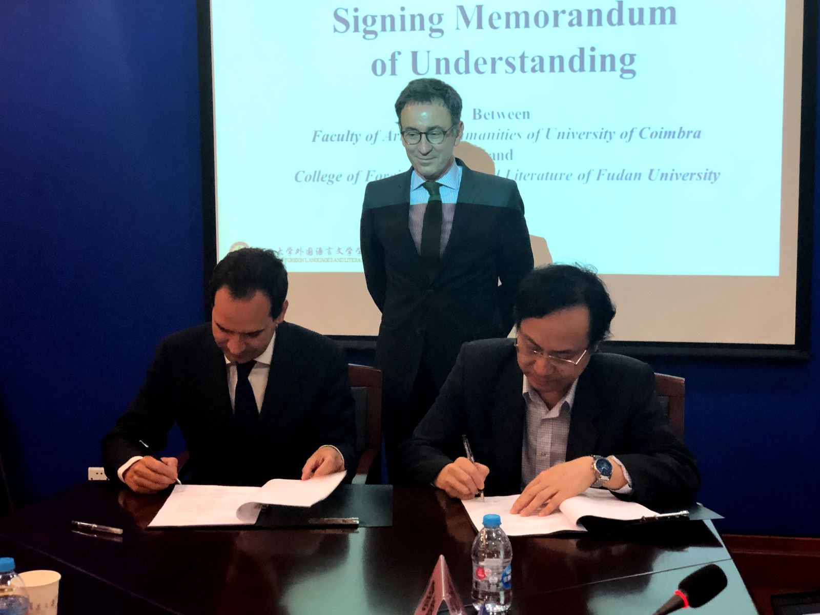 2019年5月10日,外文学院与科英布拉大学人文学院正式签署了合作协议。签字仪式由外文学院院长助理、多语种中心主任郑咏滟主持。外文学院院长曲卫国与科英布拉大学副校长João Nuno Calvão da Silva出席并代表双方签署了合作协议,葡萄牙驻沪总领事伊萨瓦见证双方签约并致贺词。