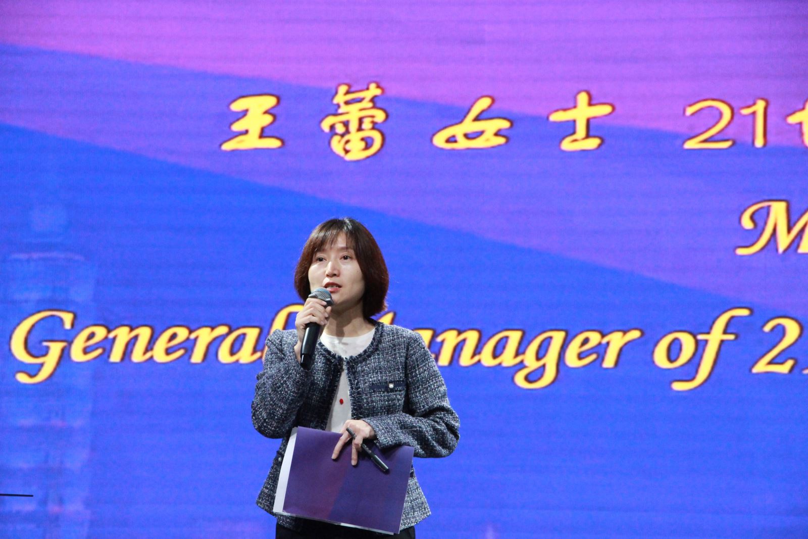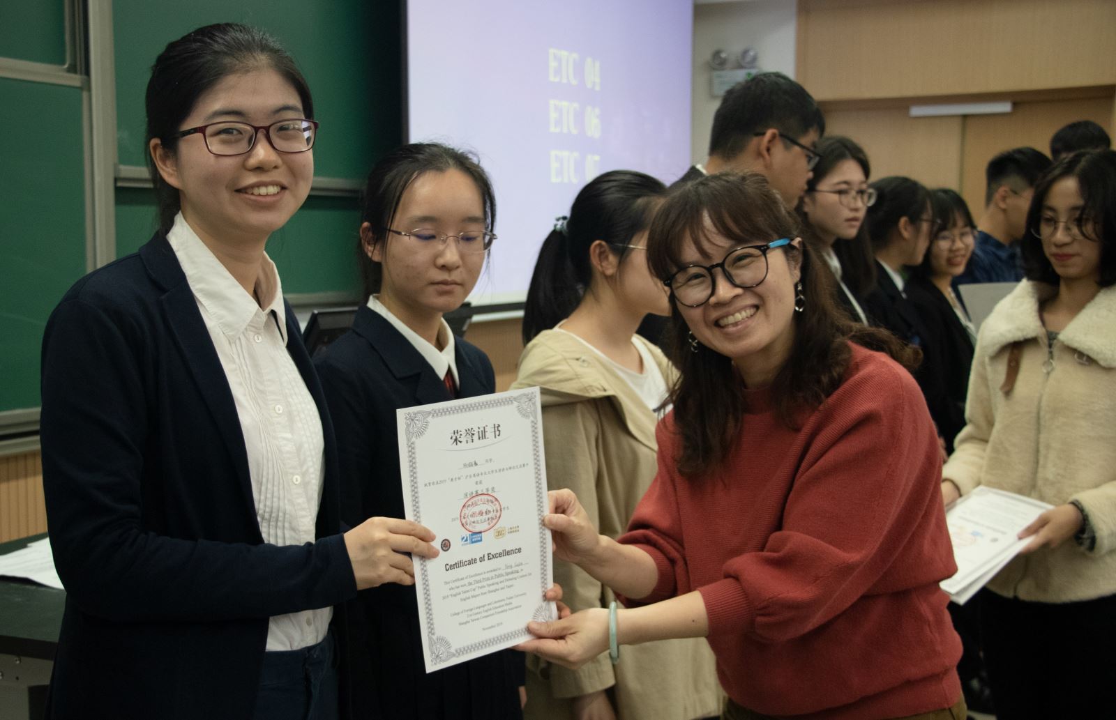 21世纪英文报在线教育事业部总编辑陈欢女士为直通卡得主政治大学王安棣、陈世贤和张恩扬颁奖