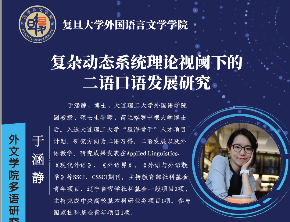 2022年6月2日,外文学院多语创新团队邀请大连理工大学外国语学院副教授、大连理工大学人才项目计划“星海骨干”于涵静为我院师生以及校内外学者进行了题为“复杂动态系统理论视阈下的二语口语发展研究”的在线学术讲座。讲座由外文学院教授郑咏滟主持。本次讲座是外文学院多语研究创新团队的系列讲座之一,校内外200余名师生在线参加了本次讲座。